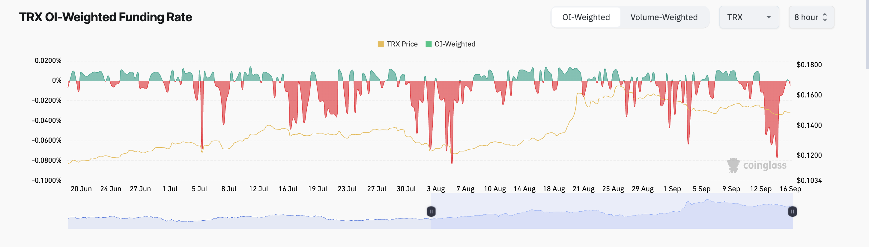 عندما تنخفض الفائدة المفتوحة لأصل ما، فإن ذلك غالبًا ما يشير إلى انخفاض نشاط التداول أو تراجع اهتمام المستثمرين. هذا يعكس أيضًا فقدان الثقة في الزخم الإيجابي لسعر الأصل، وهو ما يتضح في معدل التمويل السلبي لـ TRX.