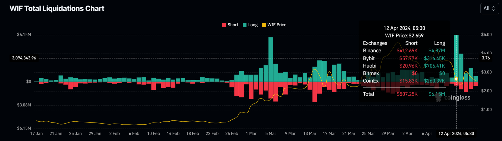 ينجم انهيار أسعار WIF عن إشارات السوق الأوسع نطاقًا، ولكن هذا سيمتد بسبب الخوف الذي تولد بين حاملي WIF. ستؤدي تصفية ما يزيد عن 13 مليون دولار من عقود الشراء إلى سحب المتداولين الصاعدين بعيدًا عن عملة الميم.