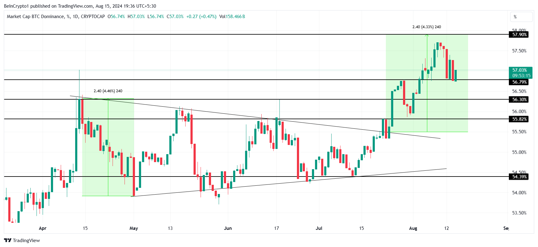في هذه العملية، كادت هيمنة بيتكوين أن تؤكد نمط المثلث المتماثل الذي تشكل قبل أربعة أشهر. تم التحقق من النمط في أواخر يوليو، واستمرت الهيمنة في الزيادة منذ الاختراق. حدد المثلث المتماثل هدفًا بعد الاختراق بنسبة 57,90%، لكن الهيمنة تراجعت بعد أن وصلت إلى 57,73%، ولم تصل إلى الهدف بقليل.
