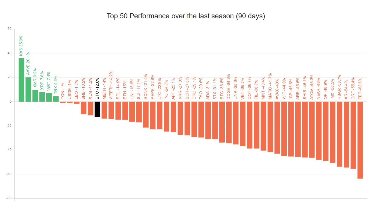 أدى هذا الارتفاع في هيمنة بيتكوين إلى تأثير سلبي على العملات البديلة، مما أدى إلى انخفاضات وعرقلة نموها خلال الـ 90 يومًا الماضية. خلال هذه الفترة، تمكنت أربعة رموز رئيسية فقط من تحقيق مكاسب كبيرة، مما سمح لها بتفوق بيتكوين وإظهار عوائد إيجابية على الرسم البياني لـ 90 يومًا.