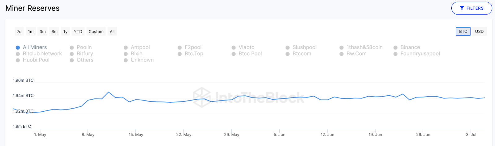 ويوضح الرسم البياني IntoTheBlock أدناه كيفية زيادة احتياطيات المعدنين منذ بداية مايو. ففي الفترة بين 30 أبريل و 6 يوليو، زاد المعدنين من احتياطياتهم بمقدار 20 ألف بيتكوين.