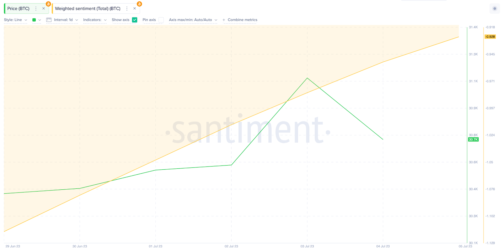 وفي نفس السياق، تحسنت معنويات السوق المحيطة بعملة بيتكوين هذا الأسبوع. ووفقًا لمنصة تحليلات البلوك تشين Santiment، استقرت مشاعر البتكوين المرجحة حول -1.12 في نهاية يونيو. ومع ذلك، فمع حلول 6 يوليو، شهدت تحسنًا بنسبة 24%، واتجه بصورة تصاعدية إلى -0.9.