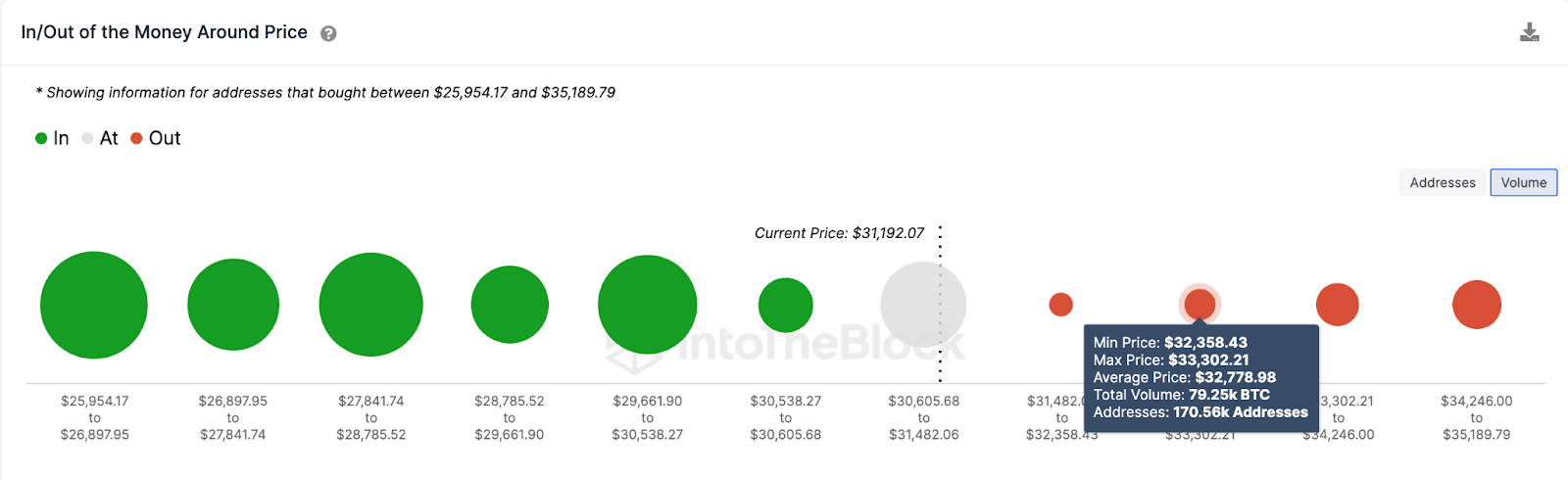 ووفقًا لبيانات In / Out of The Money المعروضة أدناه، تواجه البتكوين حد أدنى من المقاومة في طريقها إلى 35000 دولار.