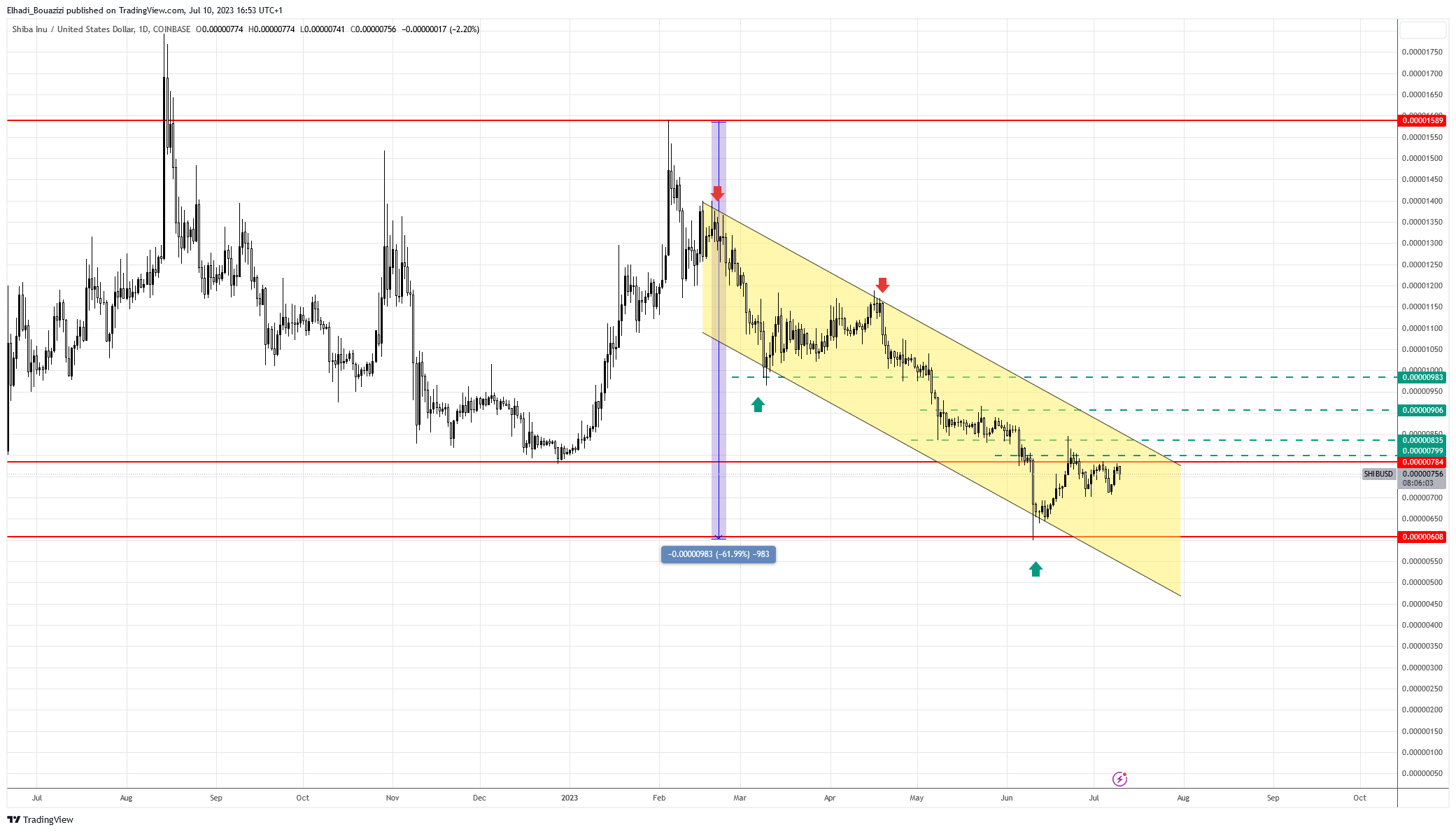 يتحرك على الرسم البياني اليومي سعر شيبا إينو SHIB في قناة سعرية هابطة. ولقد فشل في اختراق مستوى المقاومة 0.000008 دولار في موجة الصعود الأخيرة. رغم أنه اختبر حوالي ثلاث مرات.