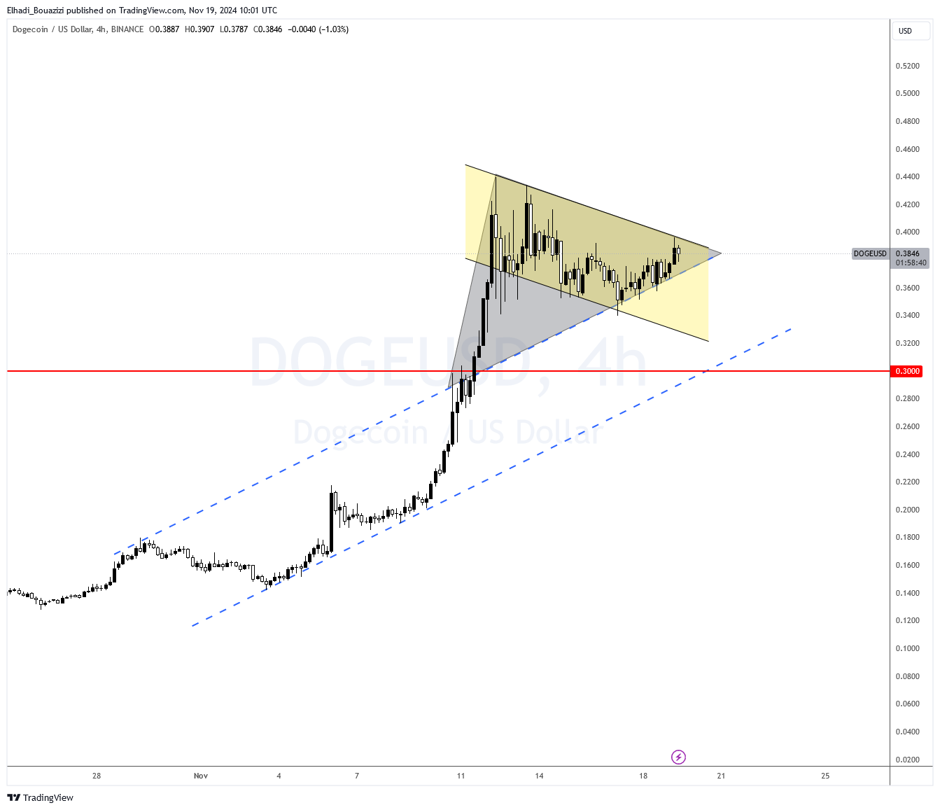 فنيا، موجة الصعود الأخيرة وتصحيح سعر دوجكوين DOGE الذي تلاها، أدت إلى تكوين نماذج فنية استمرارية. و هي "العلم الصاعد" و أيضا المثلث المتماثل على إطار الزمني 4 سا، كما هو موضح في الرسم البياني المرفق.