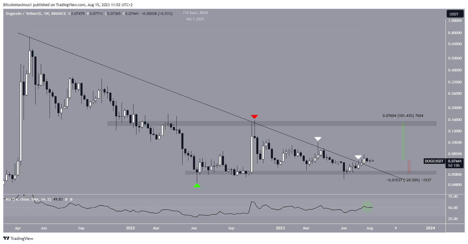 ويكشف التحليل الفني للإطار الزمني الأسبوعي أن سعر الدوج كوين قد انخفض تحت خط المقاومة التنازلي منذ أعلى سعر عند 0.739 دولار في مايو 2021. ليبلغ الانخفاض ذروته مع أدنى مستوى عند 0.049 دولار في يونيو 2022.