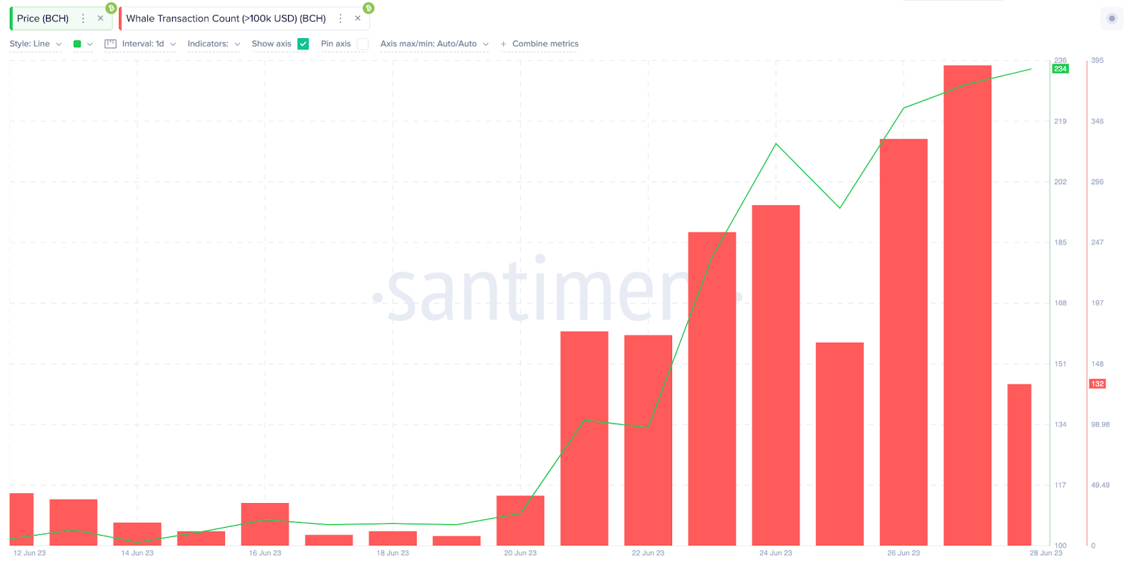 Sponsoredويستفيد المستثمرون من ارتفاع البتكوين كاش بعد افتتاح البورصات الجديدة في 20 يونيو، وشهدت العملة المشفرة ارتفاعًا تدريجيًا في معاملات الحيتان. كما يُظهر مخطط Santiment أنه في 20 يونيو، تم تسجيل نحو 102 معاملة كبيرة فقط على شبكة البتكوين كاش. لكن بحلول 27 يونيو، ارتفع هذا الرقم بنسبة 700% إلى 766 صفقة.