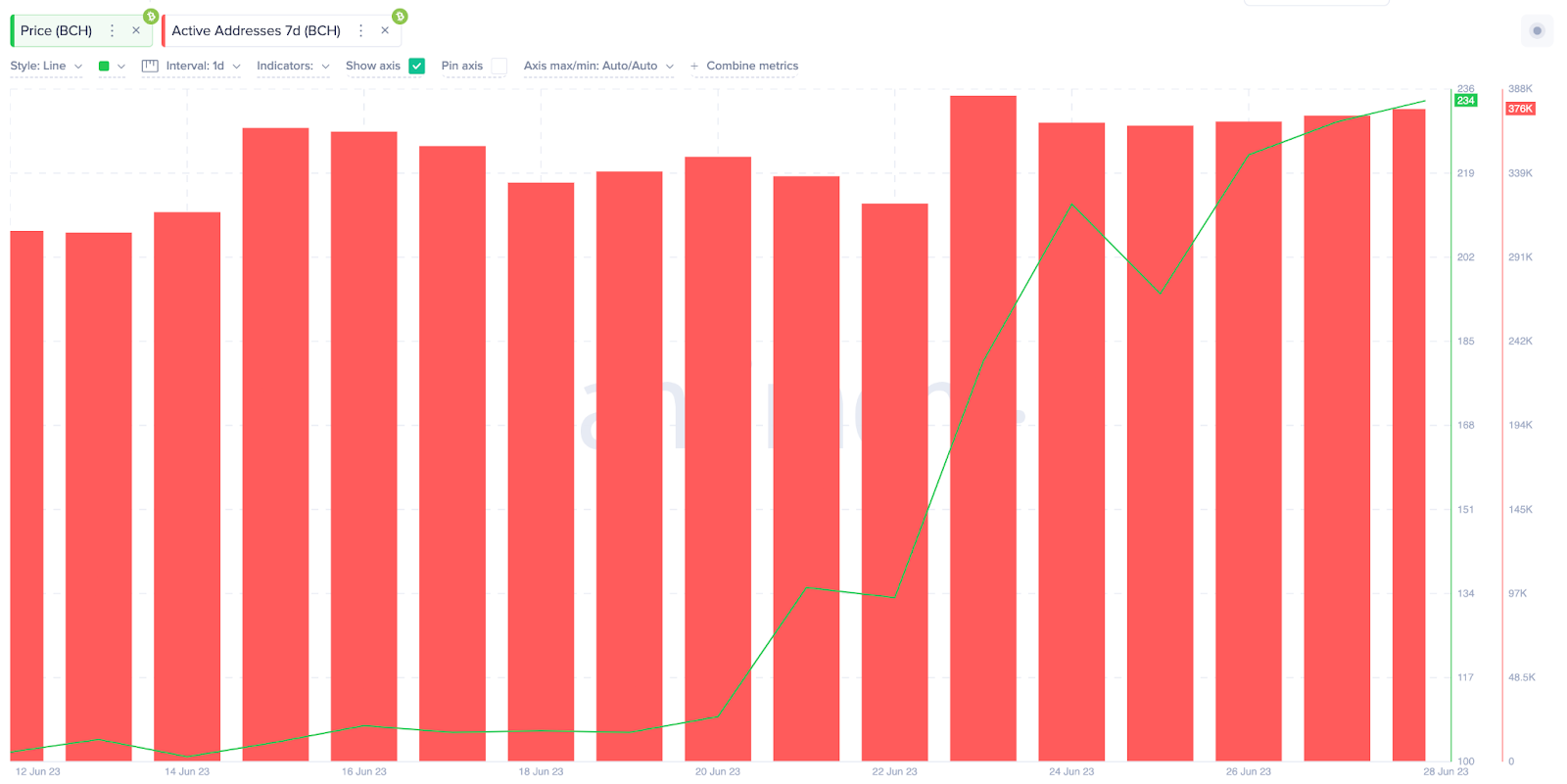 وفي الفترة بين 22 يونيو و 28 يونيو، ارتفع عدد عناوين المحفظة النشطة من 302030 إلى 376620 عنوانًا نشطًا للمحفظة. ليمثل هذا ارتفاعًا بنسبة 25% في نشاط المستخدم اليومي خلال آخر سبعة أيام تداول.