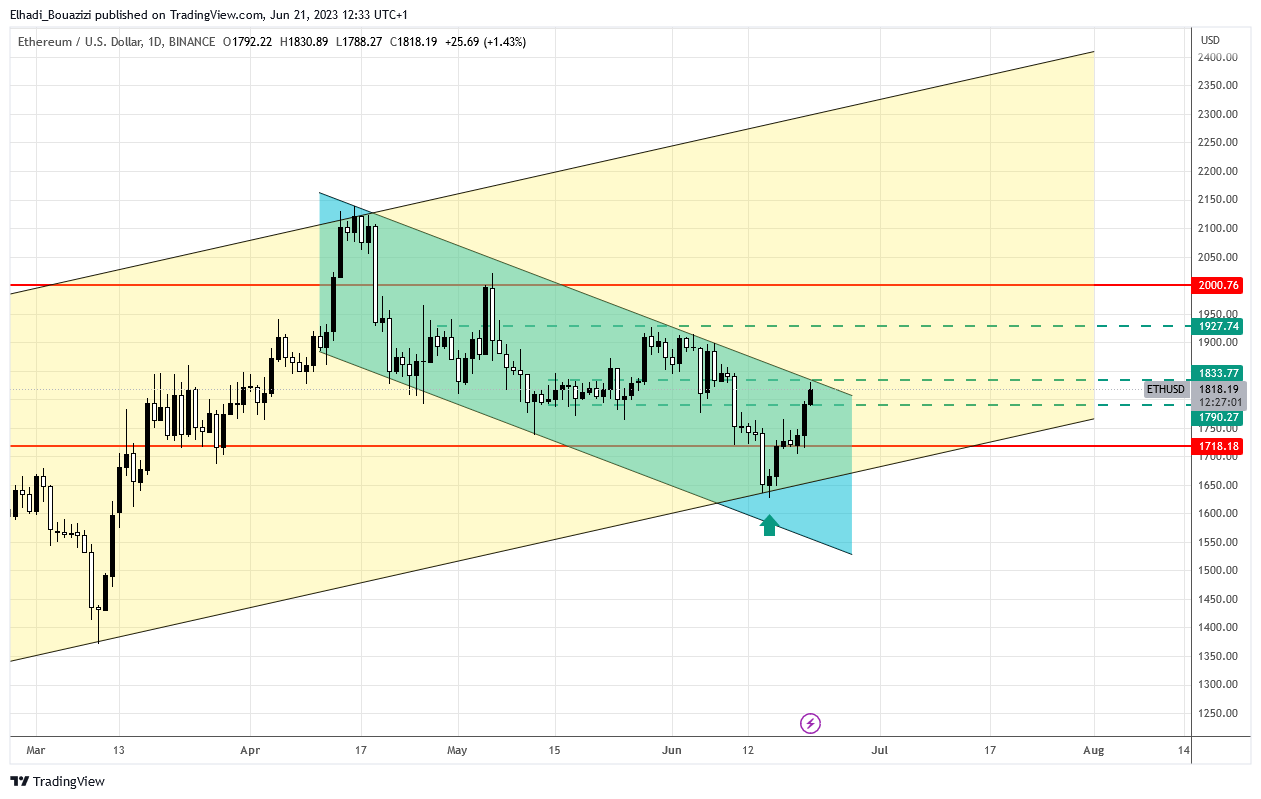 اختبر سعر ETH الحد العلوي للقناة السعرية في منتصف شهر أبريل الماضي. ومنذ ذلك الوقت والسعر يتحرك داخل قناة سعر فرعية هابطة.