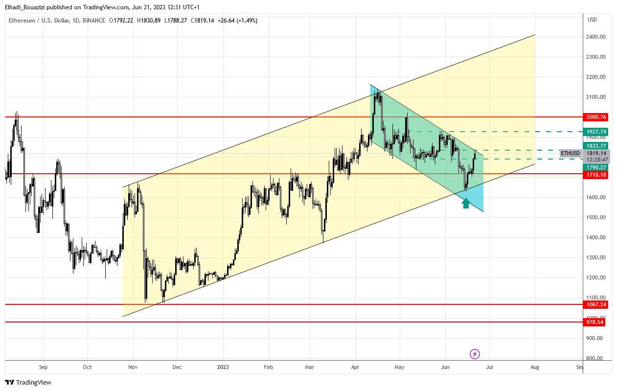 لنقلي نظرة على الصورة الكبيرة في الرسم البياني اليومي لحركة سعر إيثيريوم ETH. هناك قناة سعرية صاعدة بدأت في التشكل في شهر نوفمبر من عام 2022. و سعر ETH في موجة الهبوط الأخير ارتد مباشرة عندما لامس الحد السفلي لتلك القناة (سعر إيثيريوم كثيرًا ما يحترم المستويات الفنية خاصة على الأطر الزمنية فوق أربع ساعات).