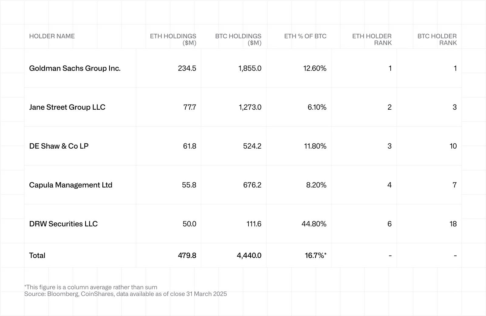 أكبر الجهات المؤسسية المالكة لإيثريوم مقابل بيتكوين حتى نهاية مارس 2025