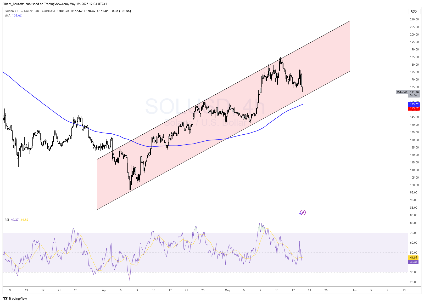 من خلال تحليل الرسم البياني اليومي، يتبيّن أن سعر عملة سولانا تتحرّك داخل قناة هابطة طويلة الأمد، تمتد من القمم المسجّلة نهاية 2023. وقد حاول السعر خلال أبريل الماضي اختراق الحد العلوي لهذه القناة، إلا أن المحاولة لم تُتوَّج بالنجاح، حيث ارتد السعر من تلك الحدود في بداية مايو.