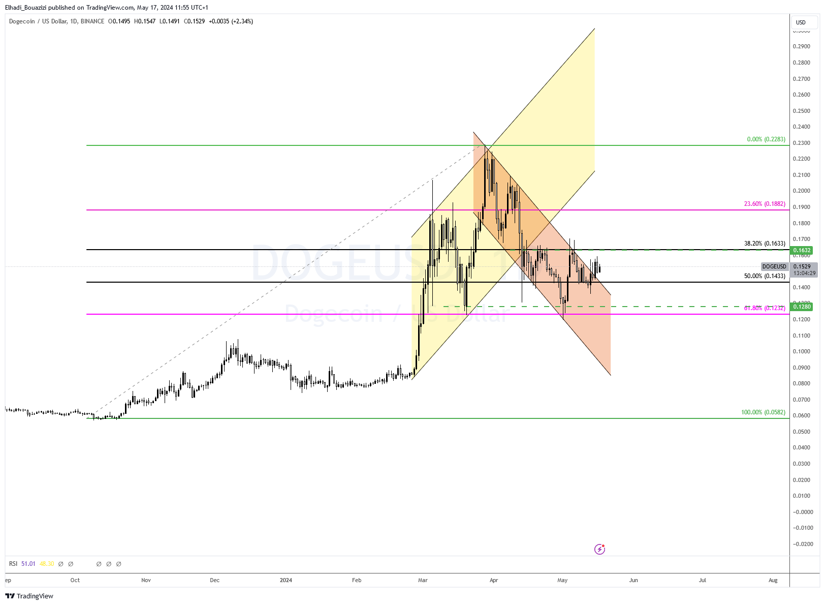 على الرسم البياني اليومي، سعر دوجكوين DOGE كان يتحرك في قناة سعرية هابطة. و رغم أنه تمكن من اختراق الحد العلوي إلا أنّه ظلّ يتحرك في نطاق جانبي منذ منتصف شهر أبريل الماضي. بعد أن فشل في اختراق مستوى المقاومة 0.1633 دولار عند تصحيح فيبوناتشي 38.2%.