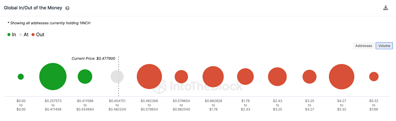 في نفس السياق، تظهر البيانات على السلسلة أن عملة 1INCH من المحتمل أن تستعيد منطقة 0.60 دولار خلال الأسابيع القادمة. ومع ذلك، فمع تزايد عدد الحيتان ينبغي على المستثمرين الدفاع أولاً عن مستوى الدعم 0.45 دولار.
