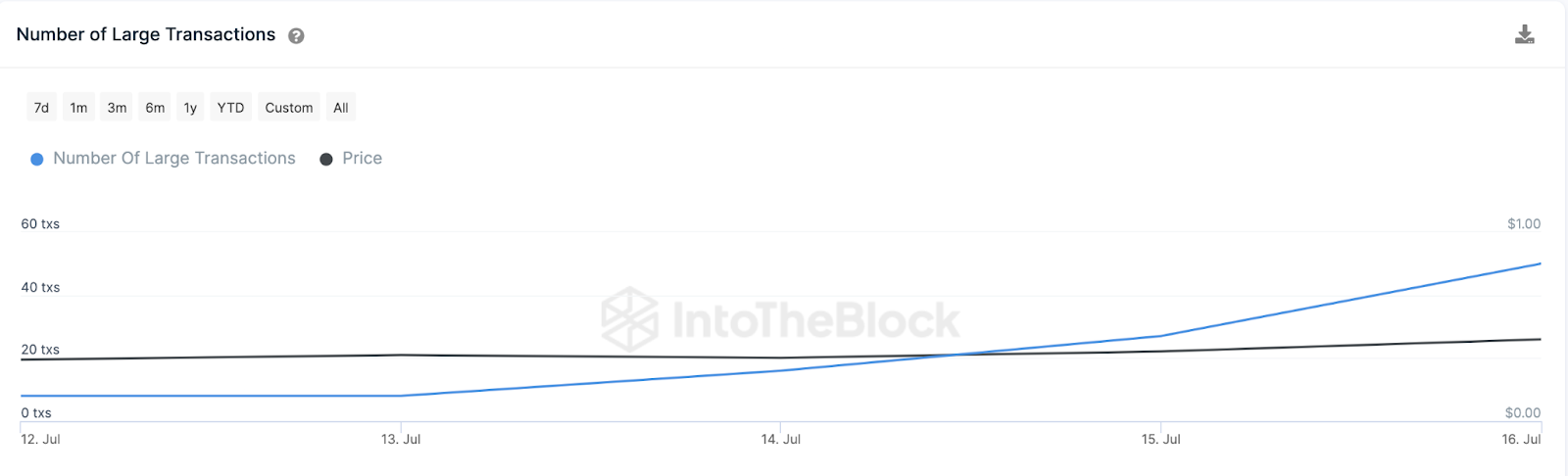 ويوضح الرسم البياني أدناه أنه في 12 يوليو، أجرت الحيتان 8 معاملات فقط. ونما هذا الرقم بشكل تدريجي ليصل إلى 50 صفقة حيتان في نهاية يوم 16 يوليو.