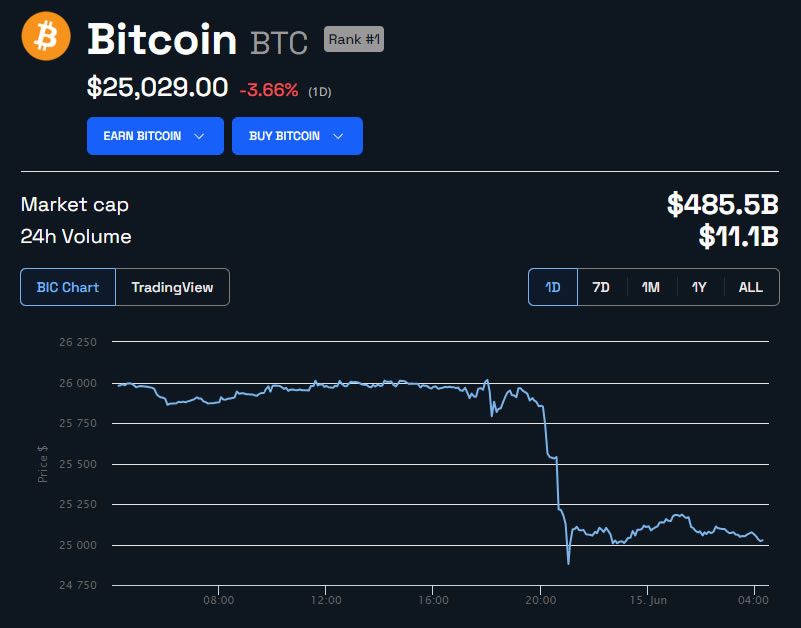 حيث تراجعت بتكوين إلى أدنى مستوياتها خلال ثلاثة أشهر عند 24879 دولار، قبل ساعات قليلة في الساعات الأولى من يوم 15 يونيو.