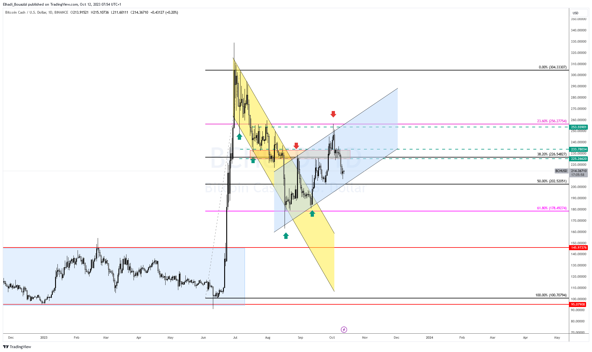 يتداول سعر BCH الآن عند 214 دولار. فوق الحد السفلي للقناة السعرية الصاعدة. وأيضا مستوى تصحيح فيبوناتشي 50% عند سعر 200 دولار.