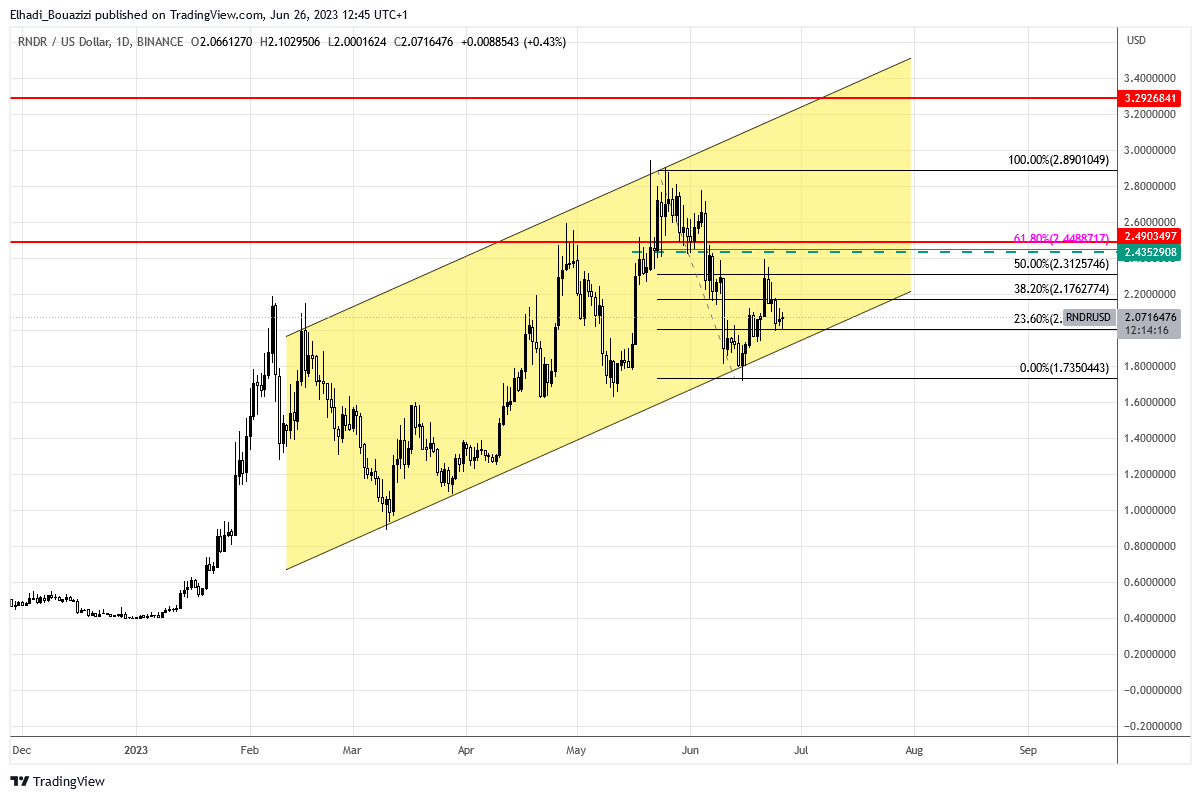 كما هو واضح في الرسم البياني اليومي المرفق لحركة سعر عملة راندر RNDR فهو يتحرك داخل قناة سعرية صاعدة منذ منتصف شهر يناير الماضي.