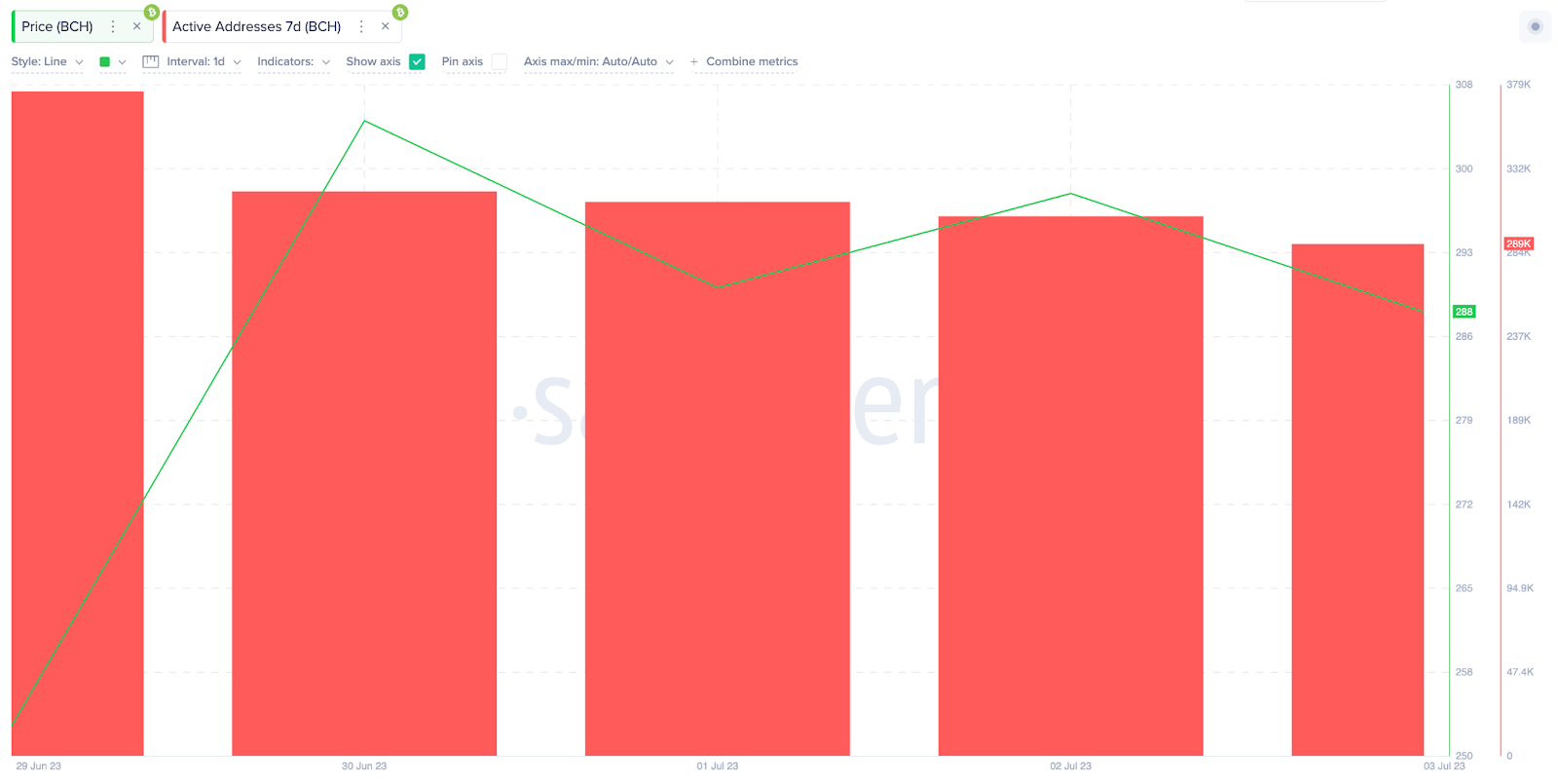 ومع ذلك، اعتبارًا من 4 يوليو، يوضح مخطط Santiment أدناه كيفية انخفاض العناوين النشطة اليومية من بتكوين كاش بنسبة 23% إلى 309000.