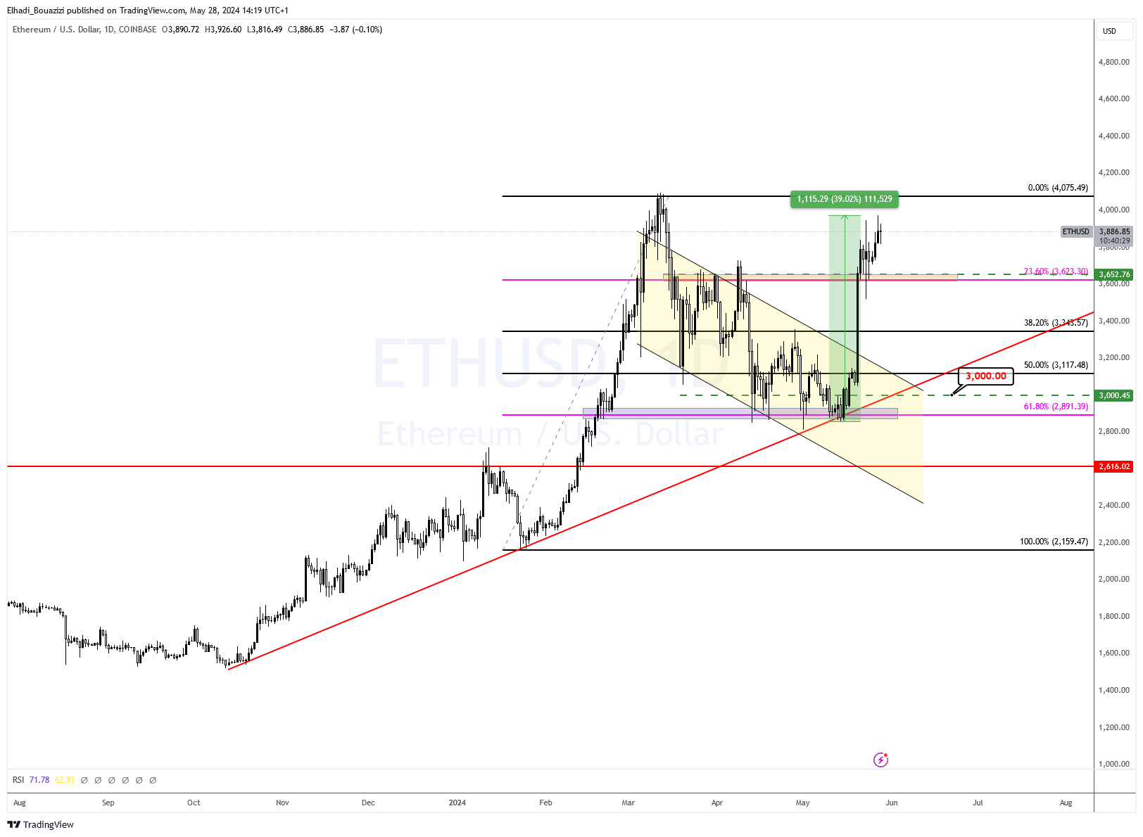 على المدى القريب من المحتمل، جدا أن نشهد عودة السعر ETH لتداول الجانبية، في انتظار تأكيد قرار الموافقة. حيث قد نشهد اختراق للمنطقة 4000 دولار نحو مستوى 4500 دولار.