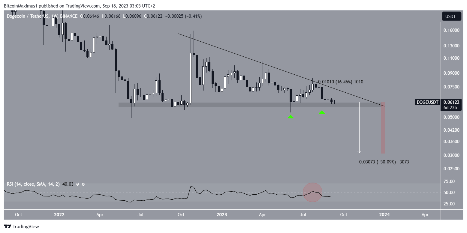 ومع ذلك، فعلى الرغم من هذه الإشارات الإيجابية، كان سعر الدوج كوين تحت الضغط بسبب خط اتجاه المقاومة التنازلي الموجود منذ نوفمبر 2022. وعندما يقترن بدعم 0.059 دولار، فإنه يشكل نمط مثلث تنازلي، يُنظر إليه عادةً على أنه هبوطي.