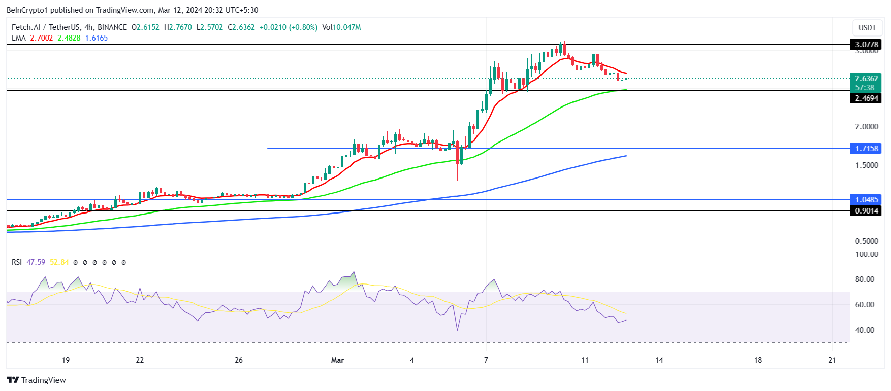 بالنظر إلى عمليات بيع الحيتان المكثفة وحركة الأسعار، يبدو أن المزيد من الانخفاض هو النتيجة الأكثر احتمالاً. يتداول سعر Fetch.ai، في وقت كتابة هذا التقرير، عند 2.63 دولار، مقتربًا من خط الدعم عند 2.46 دولار.