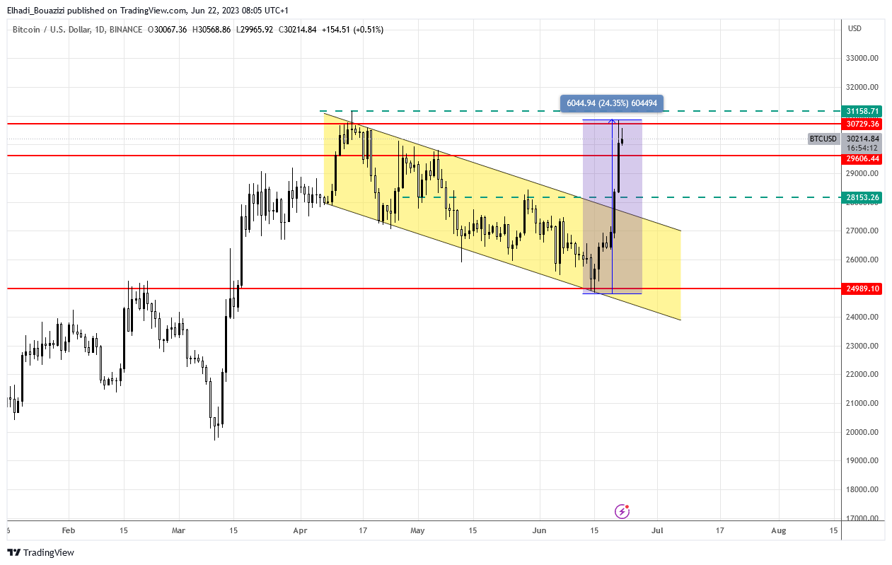 وكانت أكبر عملة رقمية من حيث رأس المال قد بلغت ذروة ارتفاعها يوم أمس عند مستوى 30838 دولار. لتسجل بذلك ارتفاع بنسبة 25% في سبعة أيام. صعودًا من أدنى مستوياتها في ثلاثة أشهر عند مستوى 24830 دولار.