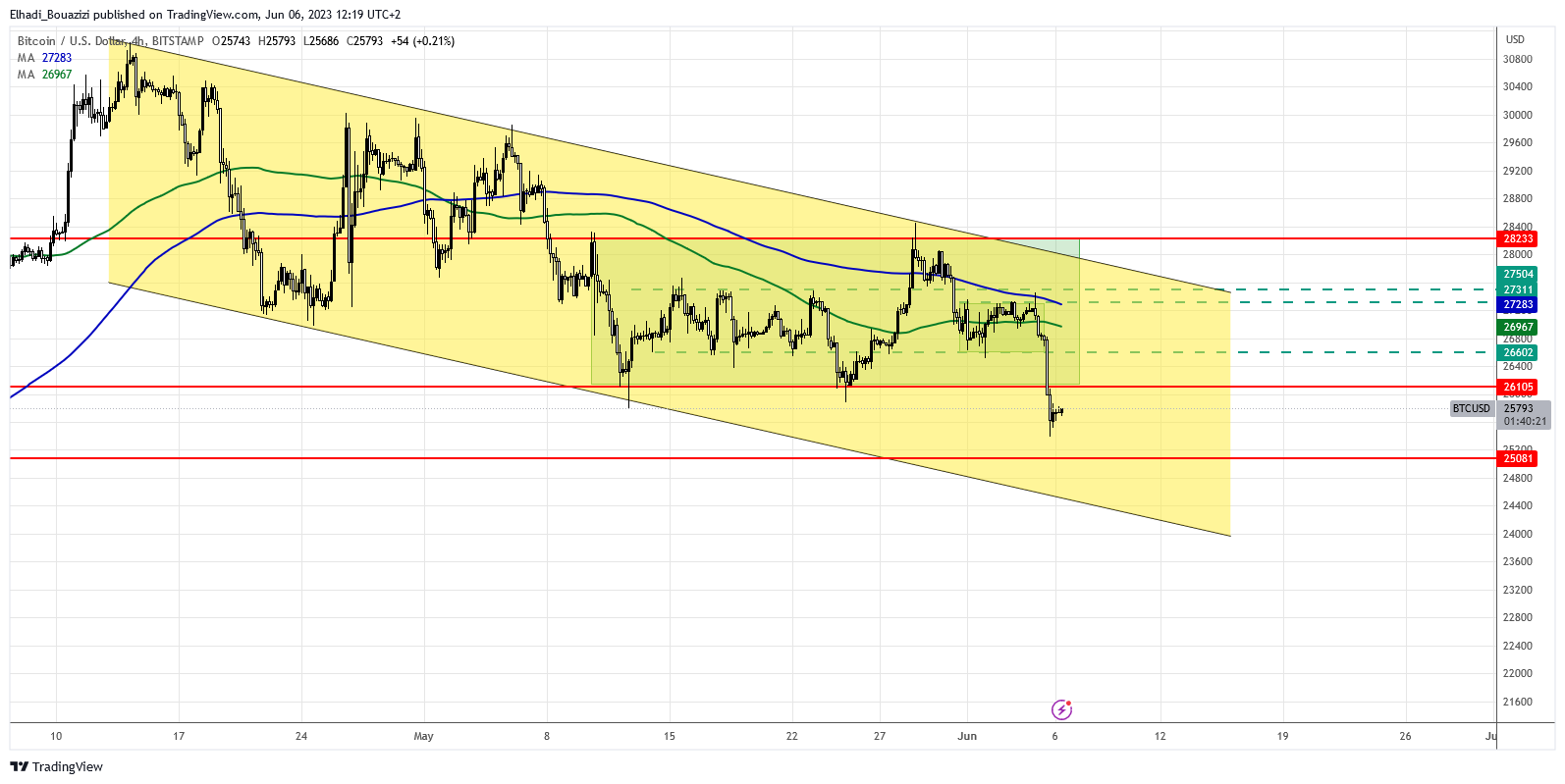أما في حالة عاد السعر فوق مستوى 26100 دولار، الذي تحول الآن إلى مستوى مقاومة. فسوف يكون إشارة على عودة الهدوء إلى السوق. وربما العودة على التداولات الجانبية.