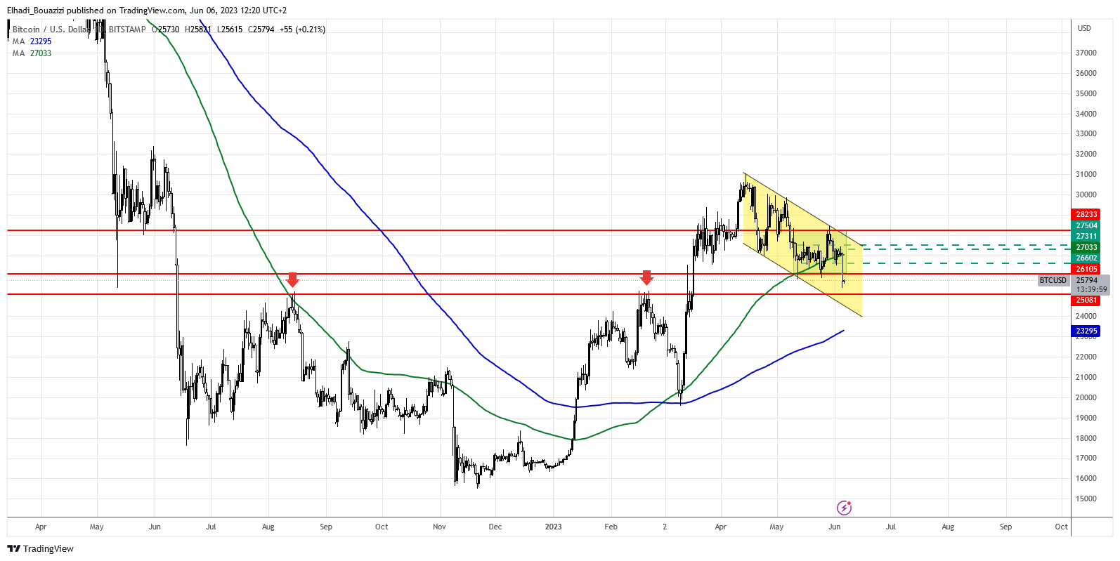 على الرسم البياني اليومي نلاحظ أن سعر بيتكوين BTC كسر مستوى الدعم القوي 26100 دولار. ولكن موجة الهبوط يقف أمامها سد منيع عند المستوى 25000 دولار، الذي يمثل مستوى دعم فني ونفسي. وأعتقد أنه أقوى من مستوى 26100 دولار.