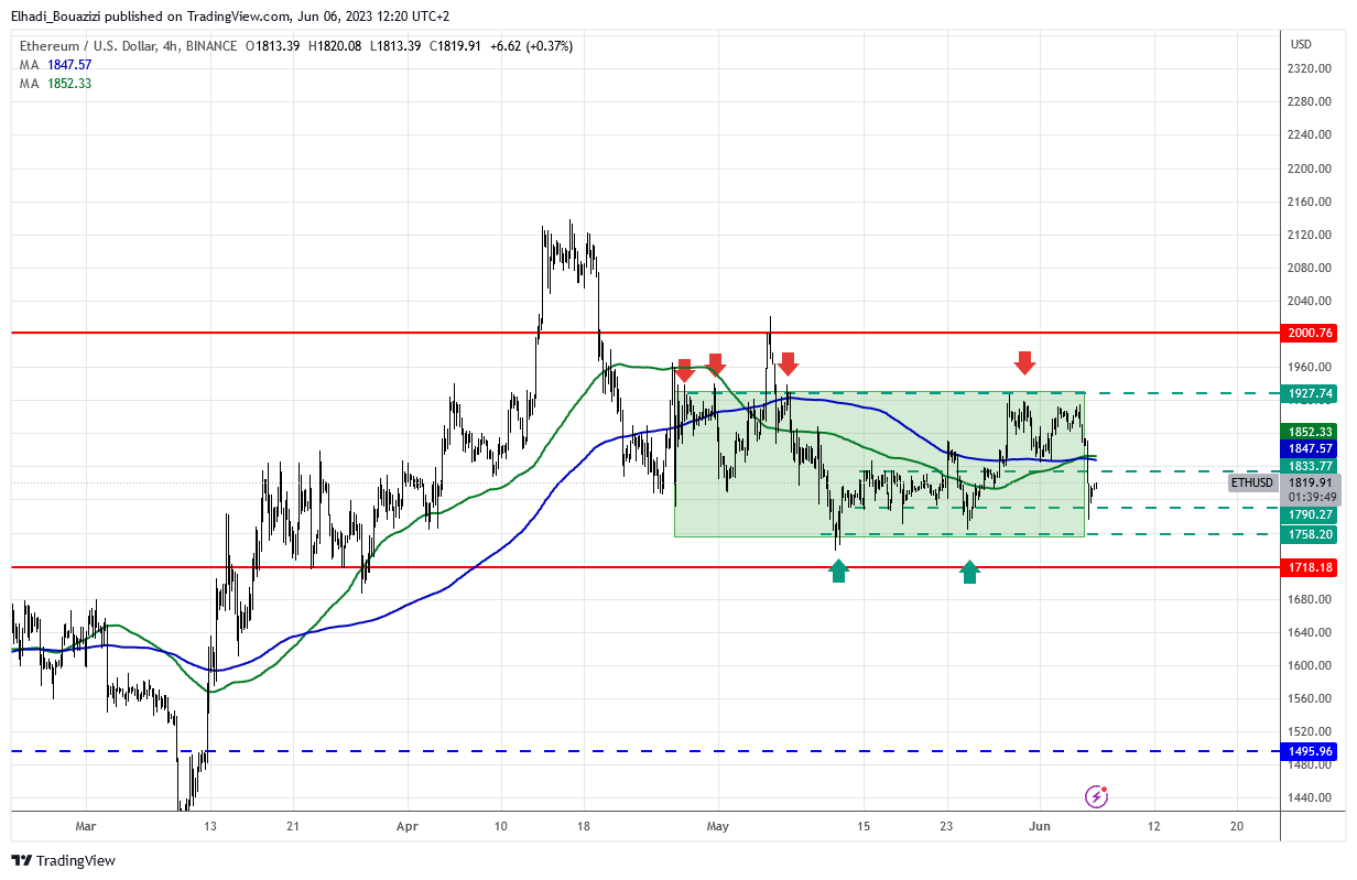 سعر إيثيريومETH مازال محصور في نطاق المستطيل الجانبي. يبقى من المهم مراقبة مستوى الدعم 1760 دولار وأيضًا مستوى 1720 دولار.
