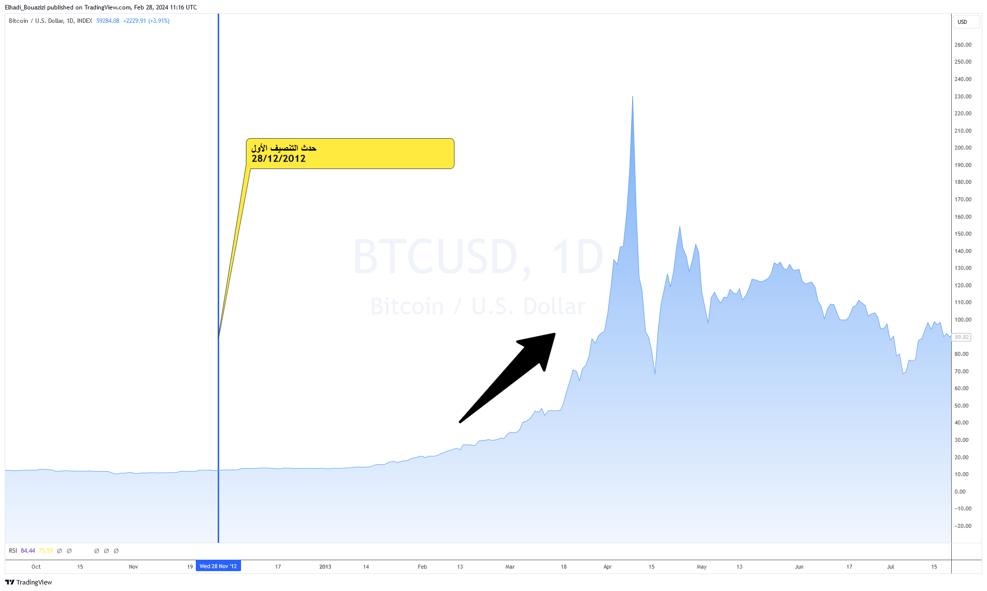 تاريخ تحركات الأسعار قبل وبعد حدث التنصيف البيتكوين