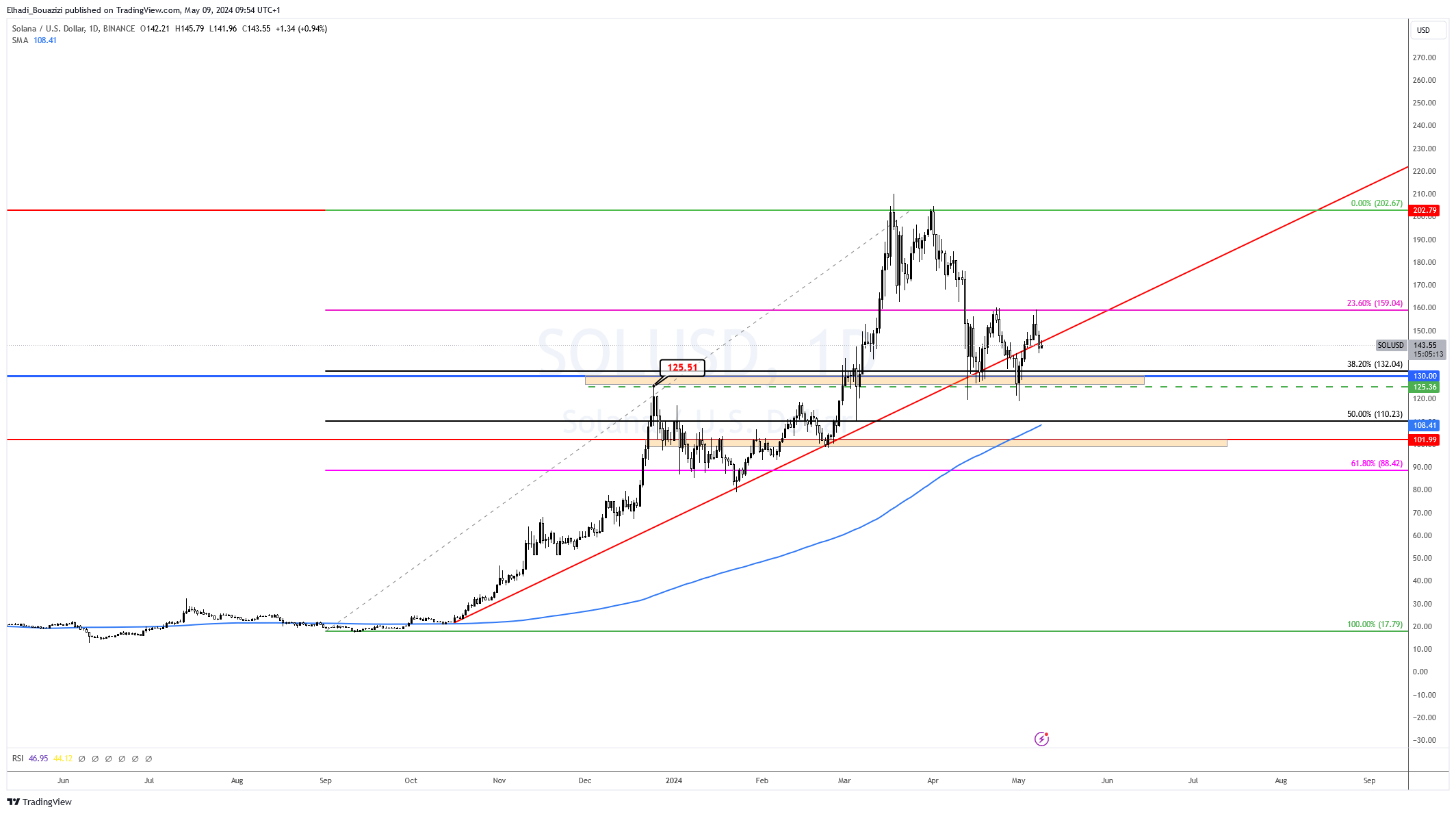 في الاتجاه الصاعد ، نلاحظ توقف سعر SOL مرتين عند مستوى المقاومة 160 دولار التي تمثل تصحيح فيبوناتشي 23.6%.