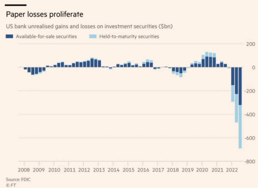 لكن بنك أوف أمريكا يتعرض أيضاً إلى المناخ المتوتر. حيث حذرت رسالة قبيسي، داخل أسواق رأس المال، من أن بنك أوف أمريكا يواجه خسائر ورقية بقيمة 100 مليار دولار من خلال استثماراته في الديون. حيث استثمر البنك 670 مليار دولار من الودائع التي قبلها خلال الوباء في سندات ذات أسعار مرتفعة وعوائد منخفضة.