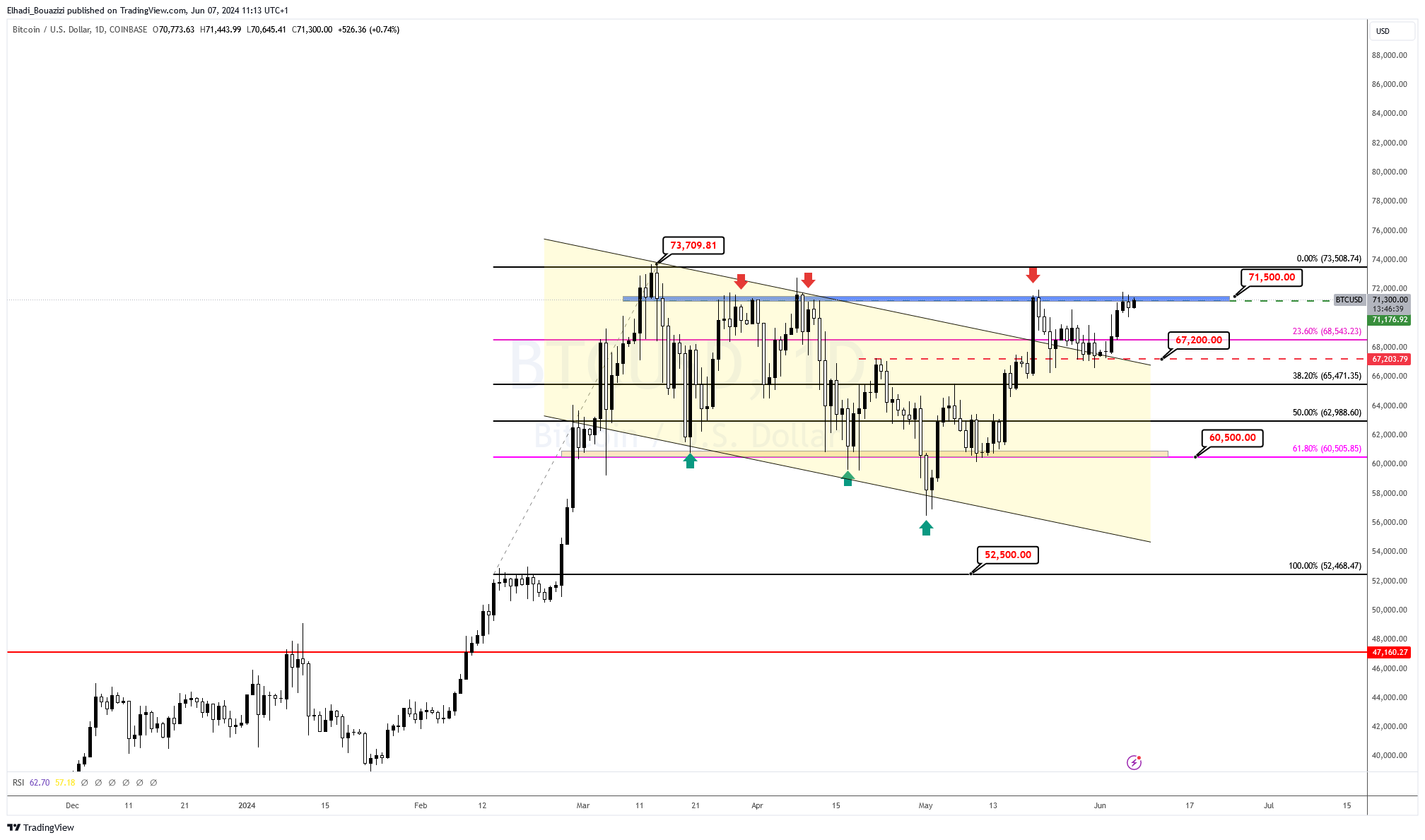 تراجع سعر البيتكوين عن محاولته لاختراق مستوى 72,000 دولار، لكنه لا يزال يتداول ضمن نطاق ضيق، مع توقعات بارتفاع قياسي جديد في الأيام المقبلة.