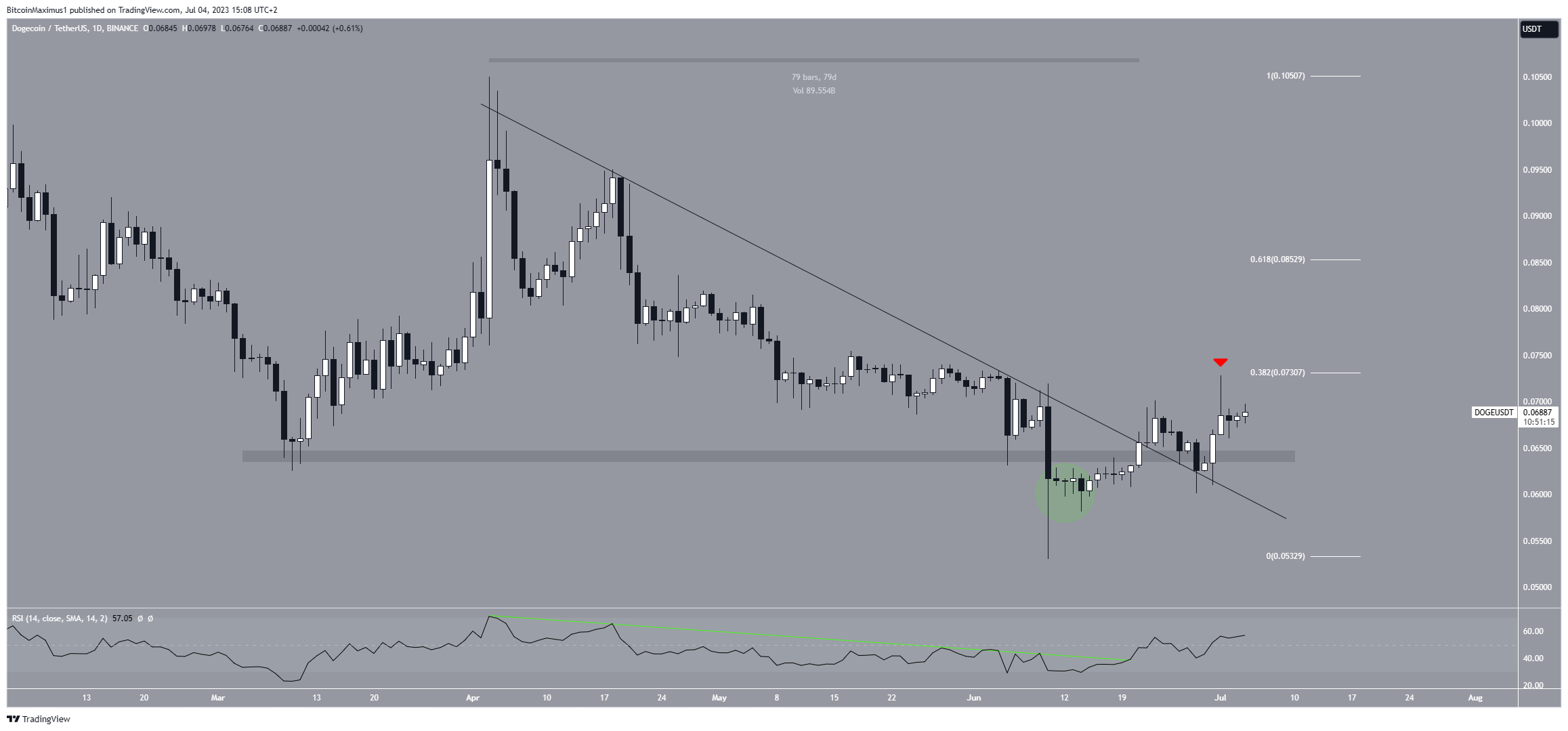 على الجانب الآخر، يوفر التحليل الفني للإطار الزمني اليومي لسعر عملة الدوج كوين نظرة تصاعدية. والسبب الرئيسي لذلك هو الانحراف (الدائرة الخضراء) أسفل المنطقة الأفقية 0.065 دولار.