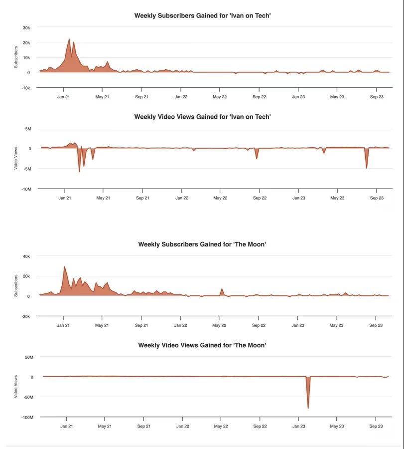 يظهر الرسم البياني زيادة العدد الأسبوعي في عدد المشتركين والمشاهدات لـ The Moon و Ivan on Tech ارتفع في أوائل عام 2021 حينما بلغت البيتكوين (BTC) ذروتها فوق 60,000 دولار ثم سقطت بسرعة إلى 30,000 دولار.