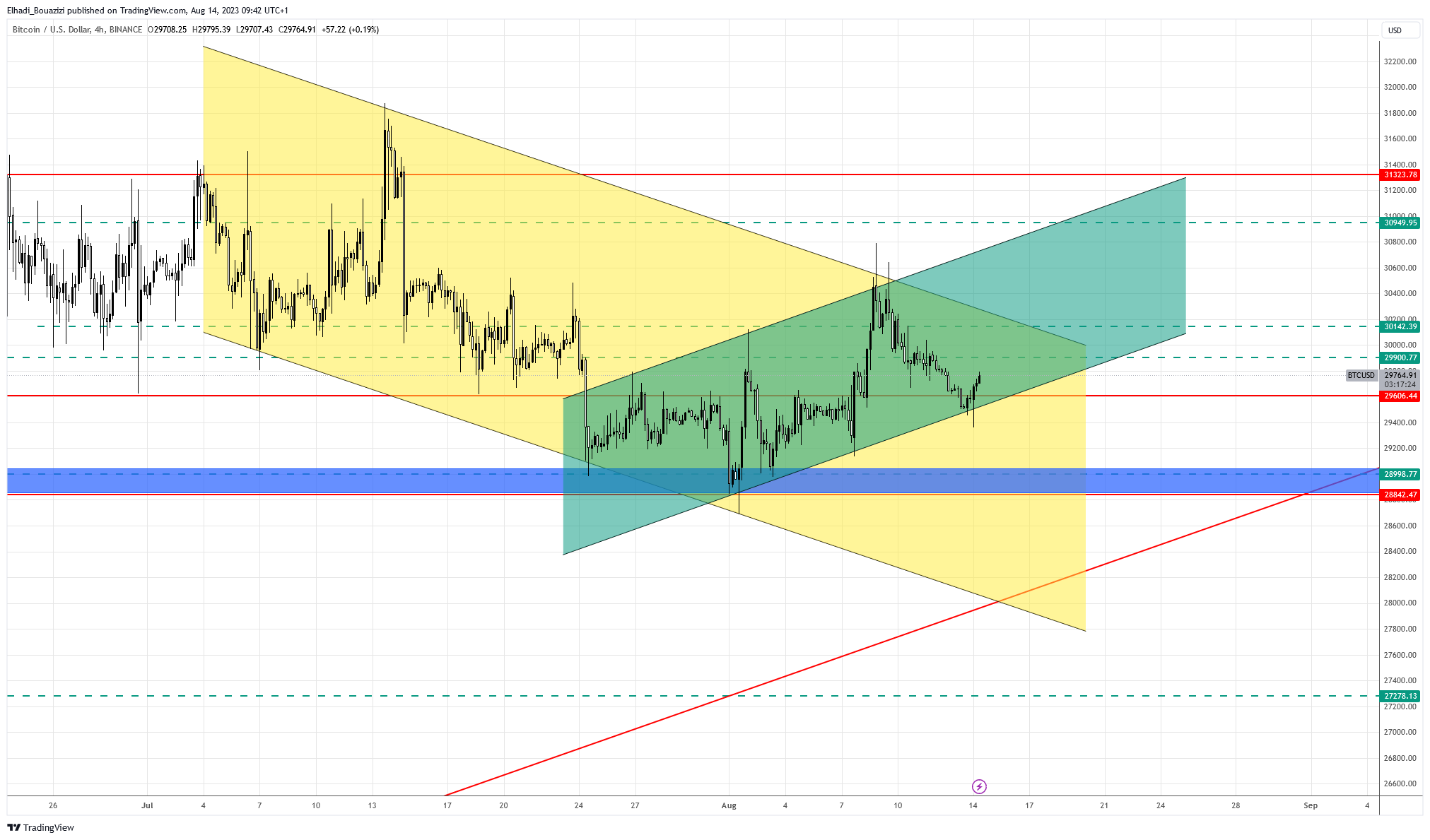 على المدى المتوسط، منذ بداية شهر يوليو والسعر يتحرك داخل قناة سعرية هابطة. كما نلاحظ تشكل مستوى دعم قوي جدا عند 29000 دولار. أي يلتقي خط الاتجاه الصاعد من مستويات قمم وقيعان سابقة.