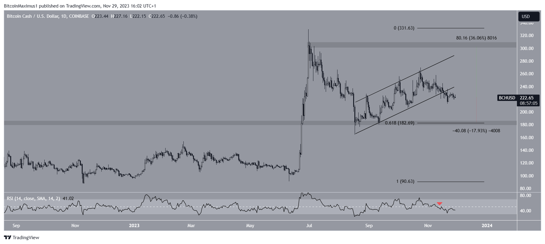 تظهر حركة السعر أن سعر (BCH) انهار من قناة موازية صعودية، والتي تعتبر نمطًا هبوطيًا. يشير الانهيار إلى أن الحركة الصعودية السابقة قد انتهت.