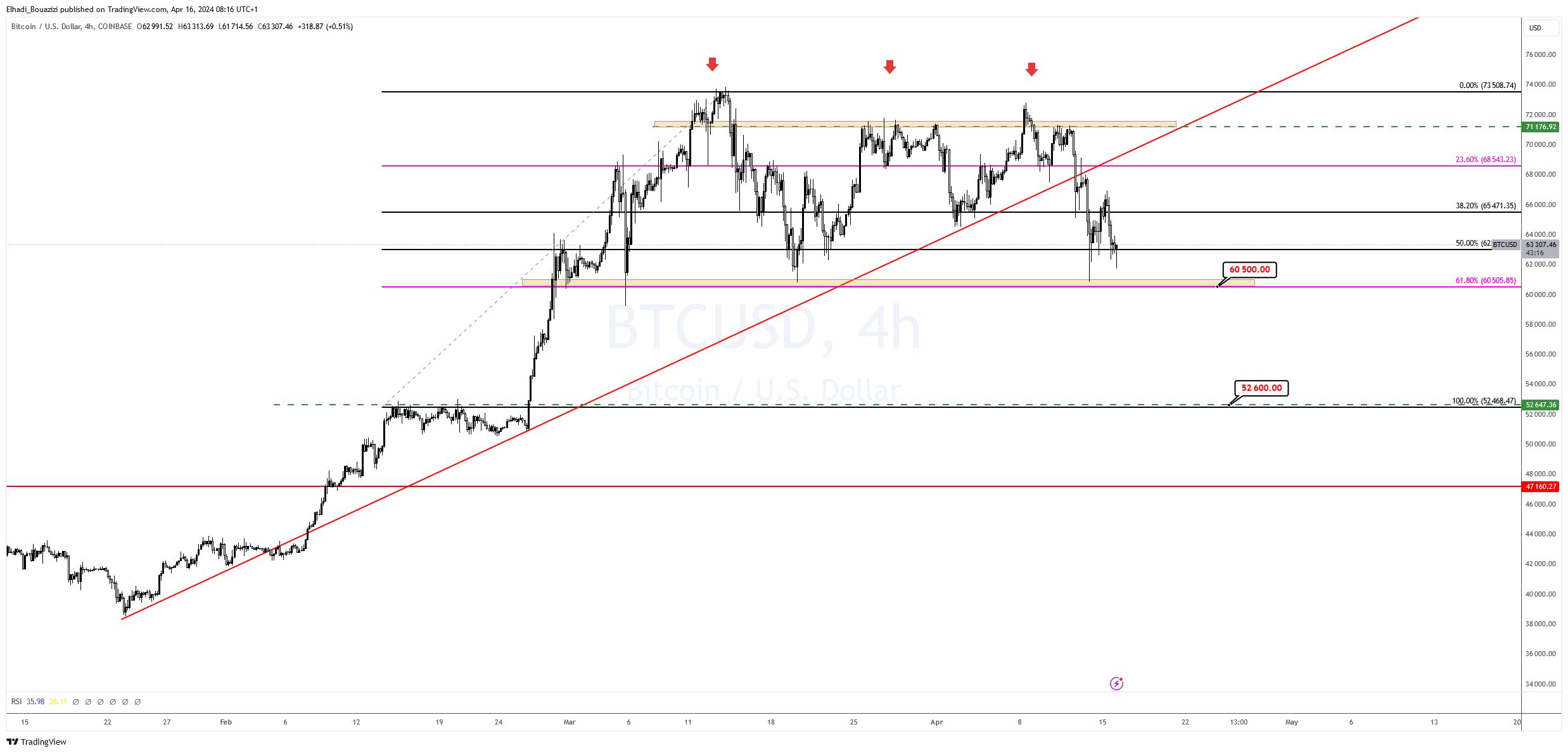 الآن، و بعد موجة الهبوط الأخيرة نلاحظ تشكّل النموذج الفني الانعكاسي القمة الثلاثية، مع خط العنق عن مستوى 60,500 دولار. و الذي يتطابق مع مستوى تصحيح فيبوناتشي 61.8%.