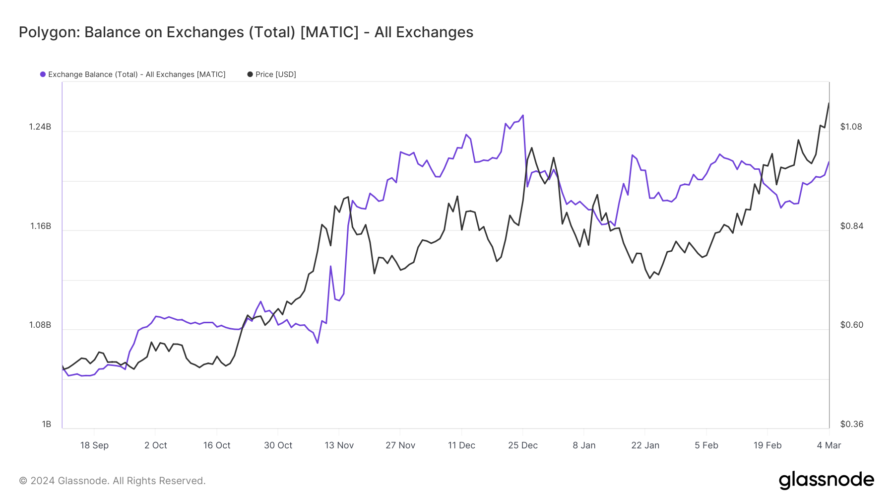 وقد يؤدي المستثمرون أنفسهم إلى انخفاض سعر MATIC حيث يبدو أنهم قرروا البدء في البيع. أشار إجمالي المعروض من MATIC المتاح في البورصات إلى زيادة قدرها 100 مليون MATIC في آخر 12 يومًا. ليصل إجمالي الحيازات إلى 1.2 مليار MATIC.