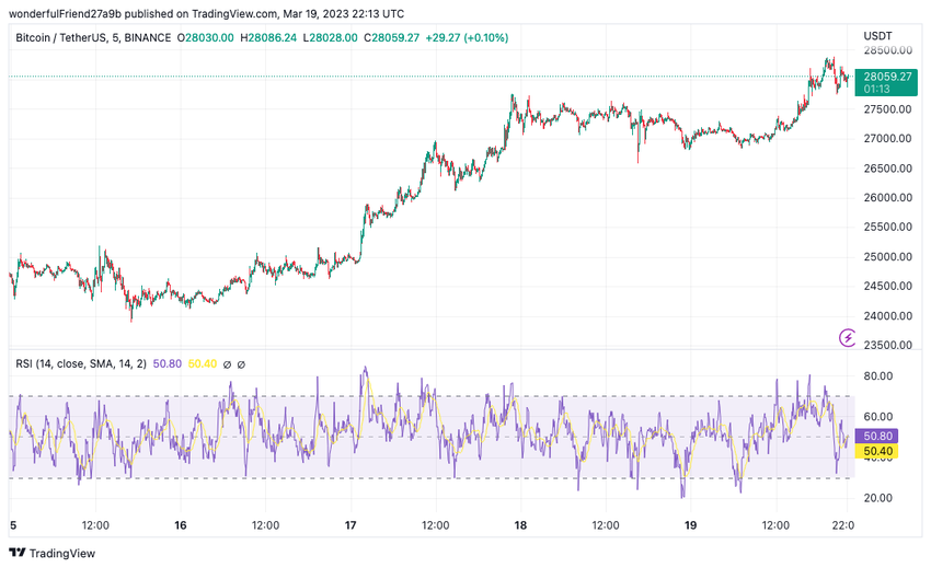 صباح يوم الإثنين 20 مارس، بلغت الزيادة اليومية في سعر بيتكوين BTC إلى 3٪. حيث بلغ سعر العملة المشفرة الأولى إلى 28.2 ألف دولار (على الساعة 1:19 دقيقة صباحًا). فيما تظهر البيانات على موقع TradingView أن هيمنة القيمة السوقية للبيتكوين وصلت إلى 47.26٪ وهي أعلى مستوياتها في 10 أشهر.