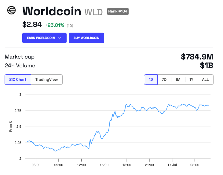 وسط هذا التطور ، ارتفع سعر WLD بنسبة 23٪ خلال ال 24 ساعة الماضية ، مما يشير إلى تفاؤل المستثمرين. حتى كتابة هذا التقرير ، يتم تداول WLD عند 2.84 دولار ، بقيمة سوقية تبلغ 784.9 مليون دولار.