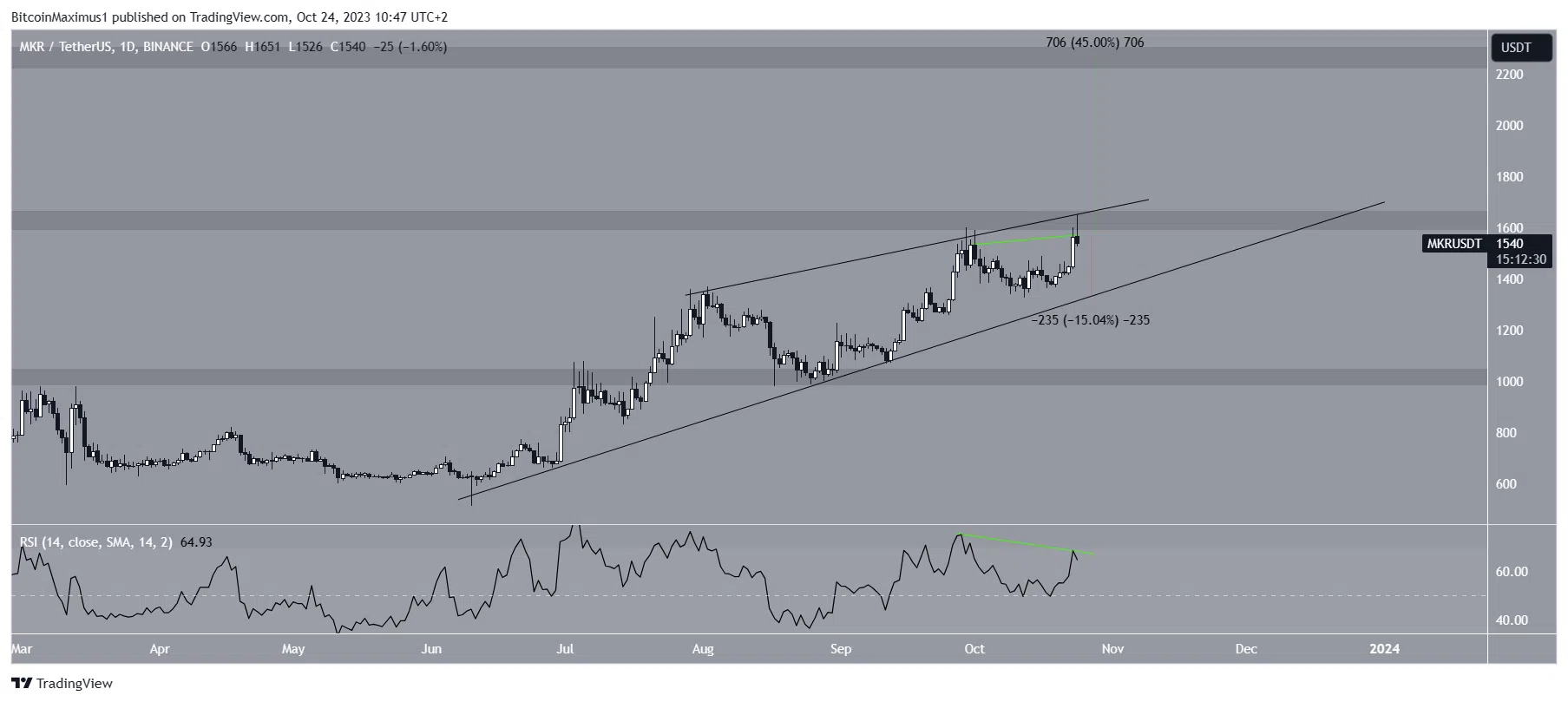 في 24 أكتوبر، وصل MKR إلى أعلى مستوى سنوي جديد عند 1,651 دولارًا. كان هذا هو أعلى سعر منذ مايو 2022. على الرغم من الزيادة، فشل MKR في الإغلاق فوق منطقة المقاومة البالغة 1600 دولار، مما أدى إلى تكوين فتيل علوي طويل (الرمز الأحمر).