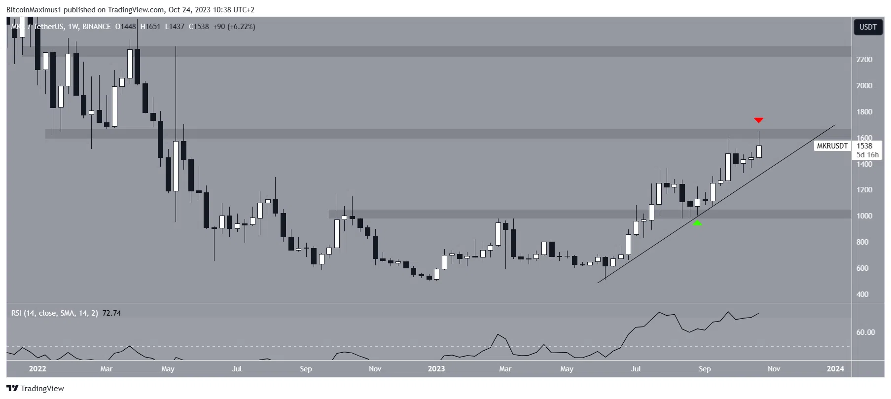 وقد بلغ سعر عملة ميكر Maker أعلى مستوى لها في عام اليوم عندما بلغت 1650 دولار. وكان هذا أعلى سعر منذ مايو 2022.