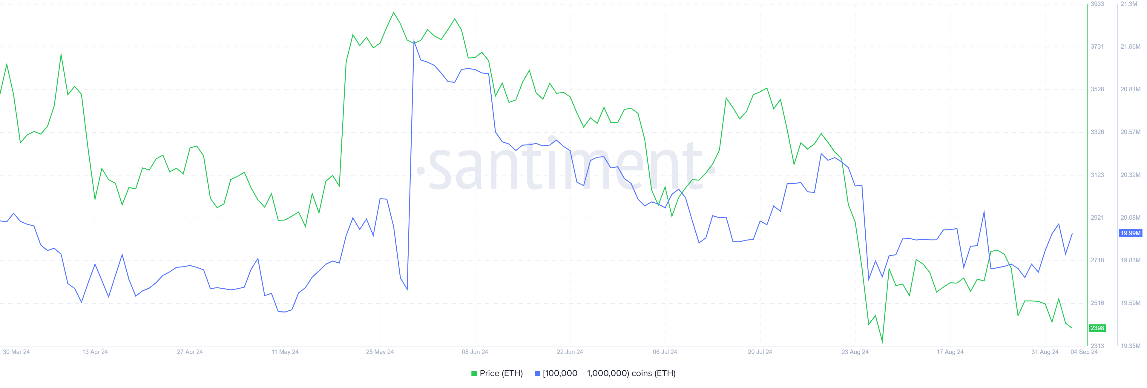 علاوة على ذلك، يبدو مزاج المستثمرين تجاه الإيثيريوم متشائمًا، خاصة عند النظر إلى تصرفات الحائزين الكبار، والمعروفين غالبًا باسم حيتان العملات المشفرة. قامت العناوين التي تحتفظ بين 100,000 إلى 1 مليون ETH بتفريغ حوالي 410,000 ETH في الأسبوع الماضي، ما يعادل قيمة تقل قليلاً عن مليار دولار بقيمة 981 مليون دولار.
