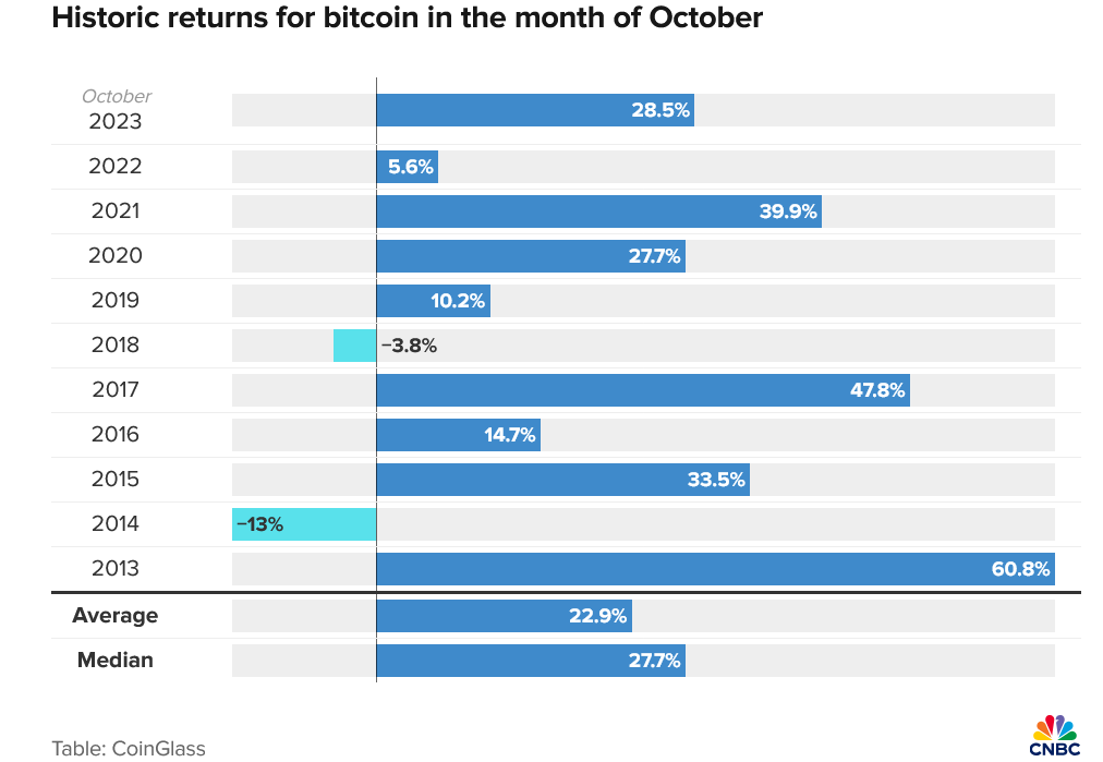 يذكر أن شهري أكتوبر ونوفمبر تاريخيًا هما أقوى شهور السنة بالنسبة لسعر بيتكوين BTC. حيث أنهى هذا الشهر على ارتفاع في جميع السنوات باستثناء سنتين منذ عام 2013، بمتوسط عائد يقارب 23%. وقد أصبح معروفًا للمستثمرين باسم "أكتوبر الصاعد.