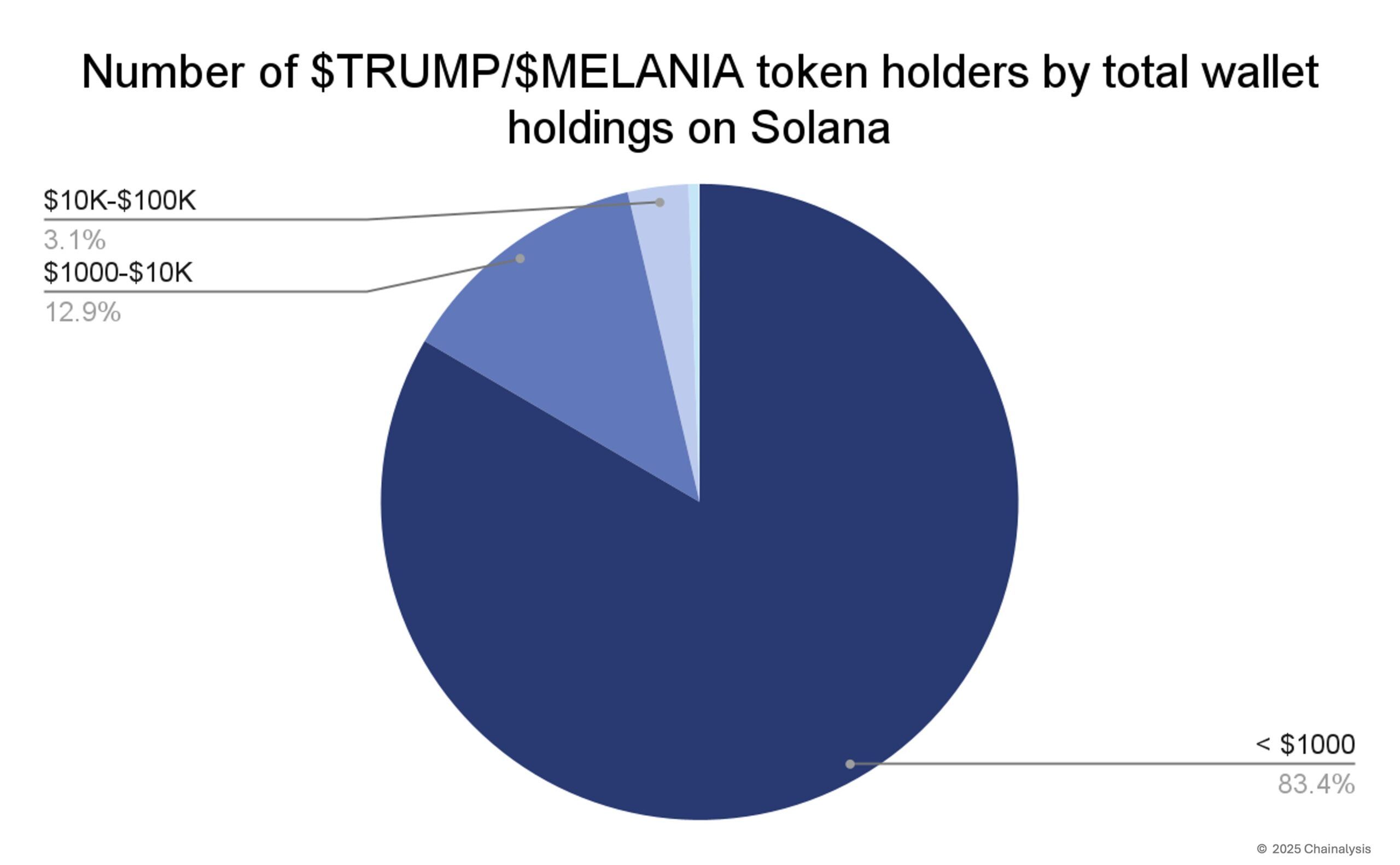 في المقابل، تُظهر البيانات أن 77% من حاملي عملة ترامب يمتلكون أصولاً تقل قيمتها عن 100 دولار، مما يعكس اعتماد السوق على نشاط المستثمرين الأفراد. في حين أن أكثر من 80% من حاملي عملتي TRUMP وMELANIA يمتلكون أصولاً تقل قيمتها عن 1,000 دولار على شبكة بلوكتشين سولانا.