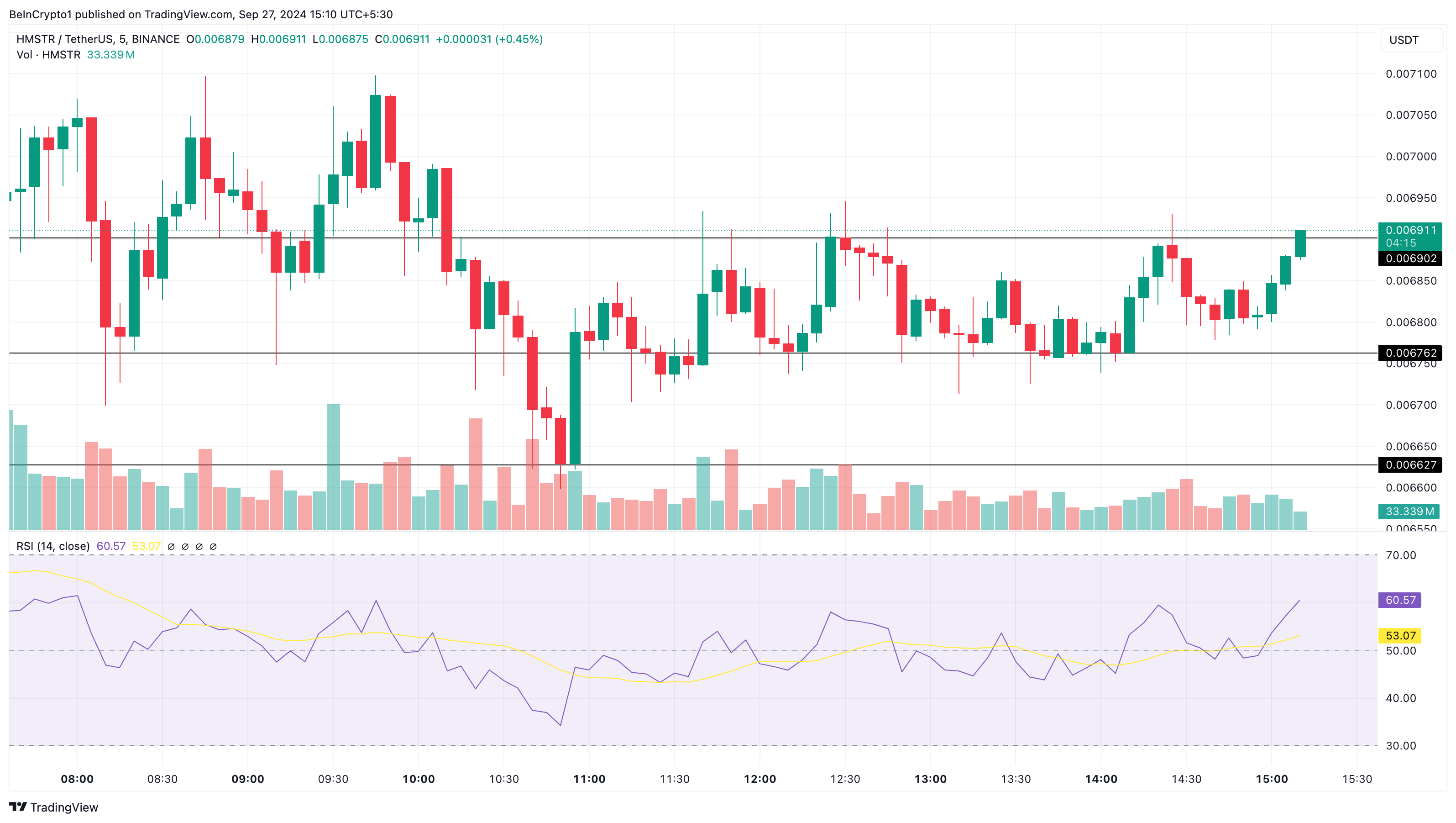 بينما قد يكون من المبكر توقع سعر HMSTR، يظهر الرسم البياني لمدة 5 دقائق أن العملة المشفرة قد وجدت بعض الاستقرار حول 0,0067$ و0,0069$. علاوة على ذلك، يتأرجح مؤشر القوة النسبية (RSI) حول خط الإشارة المحايد 50,00.