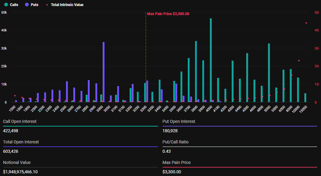 مع أسعارها الحالية، تقف بيتكوين فوق مستوى الألم الأقصى البالغ 98,000$، بينما إيثريوم تحت سعر التنفيذ البالغ 3,300$. يعتبر نقطة الألم الأقصى أو سعر التنفيذ مقياسًا حيويًا يوجه سلوك السوق. يمثل مستوى السعر الذي تنتهي عنده معظم الخيارات بلا قيمة.