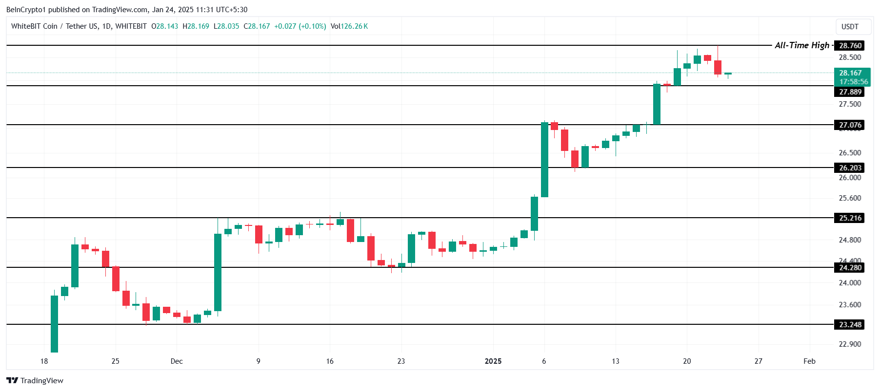 وصل WBT إلى أعلى مستوى له على الإطلاق خلال التداول اليومي في الـ 24 ساعة الماضية، حيث بلغ 28,76$ قبل أن يتراجع قليلاً إلى 28,16$. يبرز هذا الارتفاع الأخير الأداء القوي للعملة البديلة وسط سوق متقلب.